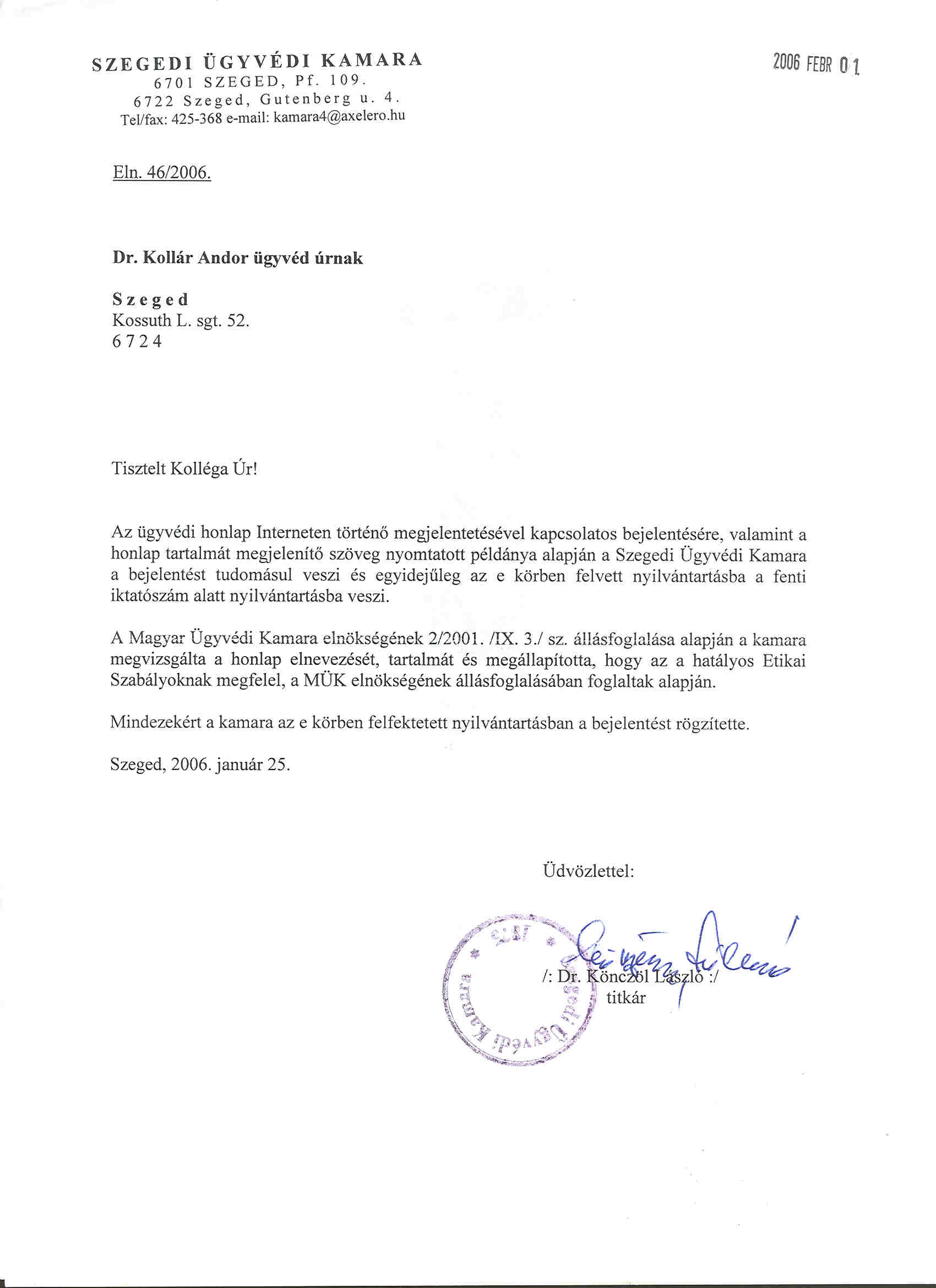 Ezt a honlapot Dr. Kollár Andor, a Szegedi Ügyvédi Kamarában bejegyzett egyéni ügyvéd tartja fenn az ügyvédekre vonatkozó jogszabályok és belső szabályzatok szerint, melyek az ügyféljogokra vonatkozó tájékoztatással együtt a www.magyarugyvedikamara.hu honlapon találhatóak.